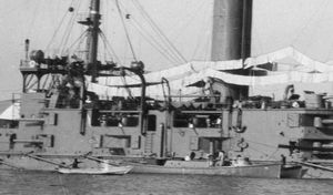 In this view, we can see the two starboard single 10-inch gun turrets of the secondary armament. The 6-inch guns do not seem to be mounted yet.