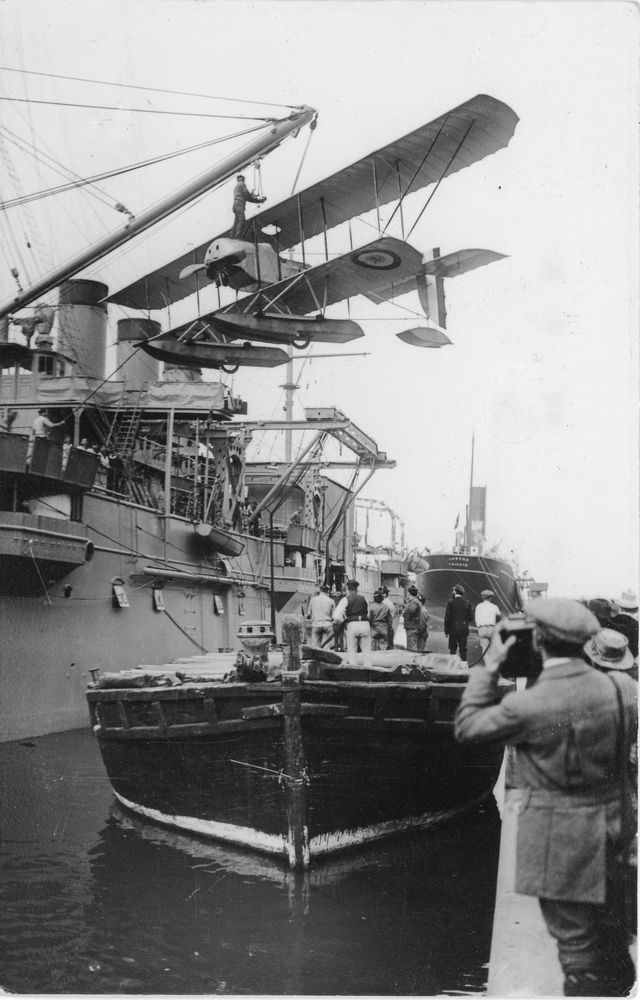 The Foudre was a torpedo boat/submarine carrier that was modified to become a floatplane carrier. A derrick is being used to bring a Caudron J onto the deck. Note the man standing on the motor, the wheels in the floats as well as the gantry for moving the torpedo boats/submarines and the keen photographer.