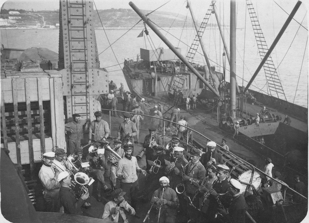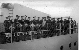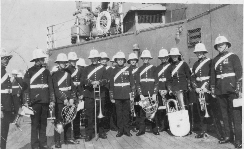 In this photograph of the band on H.M.S. Nelson we can count at least 14 Royal Marine musicians. In wartime, they would take on other functions,the 17 musicians of the band on H.M.S. Hood manned the transmission station, for example. A fleet flagship had 24 bandsmen, a squadron flagship 17 and other capital ships, aircraft carriers and heavy cruisers 15, light cruisers had 12 bandsmen.